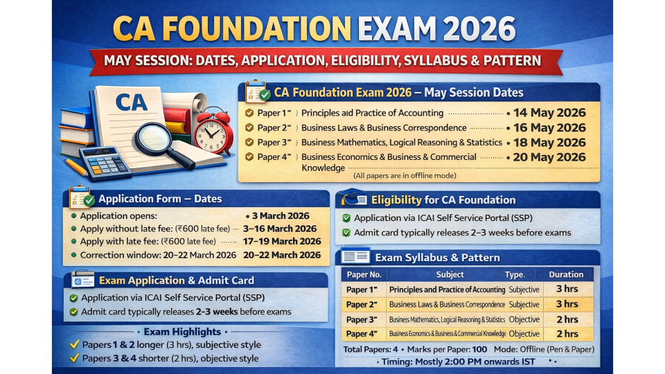 The schedule for the CA Foundation May 2026 exam, the prerequisite for the esteemed Chartered Accountancy program, has been released by the Institute of Chartered Accountants of India (ICAI). On May 14, 16, 18, and 20, 2026, the tests will be administered offline at multiple locations. In order to complete the required four-month study time, candidates hoping to make this try must make sure their registration with the Board of Studies (BoS) is finished by January 1, 2026. It is anticipated that the online exam application form procedure will begin on March 3, 2026, with a deadline of March 16, 2026, without late penalties. It is essential for preparation to comprehend the entire syllabus and exam format, which contains both objective and descriptive papers.