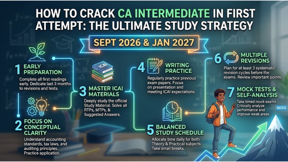 Ultimately, clearing the CA Intermediate exams is not just about how many hours you put in, but how effectively you manage your resources and mindset. By anchoring your preparation in conceptual clarity, prioritizing the ICAI study material, and maintaining a rigorous revision and mock test schedule, you transform a daunting syllabus into a manageable roadmap.Success in this journey demands more than just academic knowledge—it requires unwavering discipline and the resilience to stay focused when the pressure builds. Remember, every chapter you master and every practice paper you solve brings you one step closer to that prestigious "CA" prefix. Stay consistent, trust your strategy, and keep your eyes on the goal. Your hard work today is the foundation of your professional legacy tomorrow. You've got this!