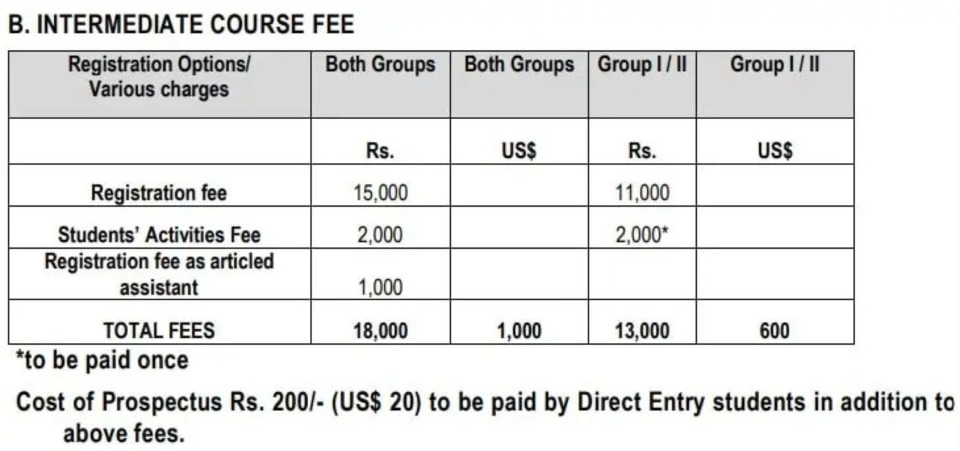 | CA Intermediate Registration Fees | ₹ 15000 | ₹ 11000 | $ 1000 | $ 625 |