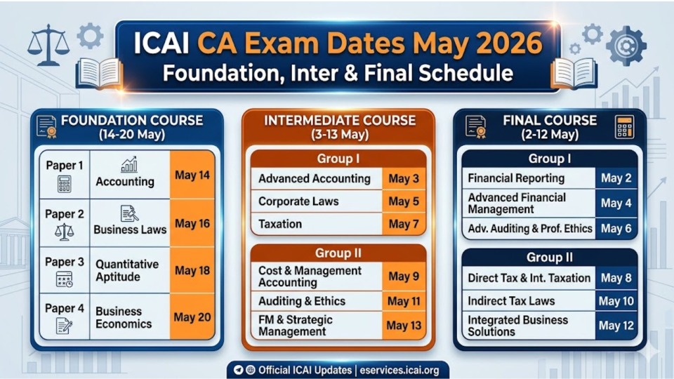 The Institute of Chartered Accountants of India (ICAI) has officially announced the exam dates for the May 2026 session. For every aspiring Chartered Accountant, these dates are the North Star for their preparation strategy. Whether you are appearing for Foundation, Intermediate, or Final levels, staying aligned with the official timetable is crucial for success.