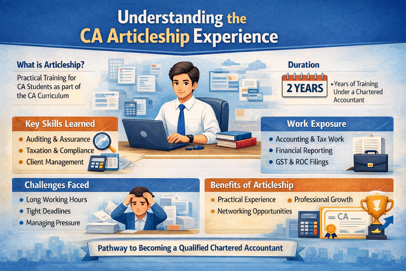 Articleship is a transformative stage in the journey toward becoming a Chartered Accountant, playing a crucial role in the professional growth and overall development of CA students. It helps bridge the gap between theoretical learning and practical application by providing valuable hands-on exposure, technical expertise, and real-world experience. Through diverse assignments, mentorship from experienced professionals, and opportunities to build soft skills and professional networks, students undergo holistic development. Articleship not only strengthens preparation for the CA Final examinations but also equips aspiring CAs with the skills and confidence required for long-term career success.